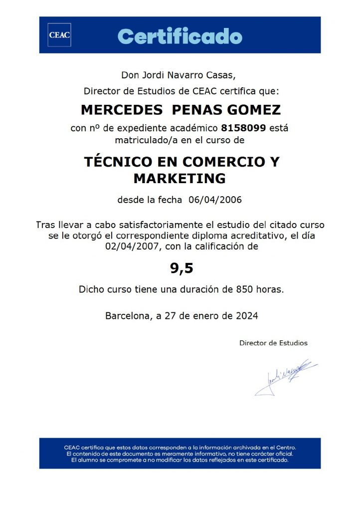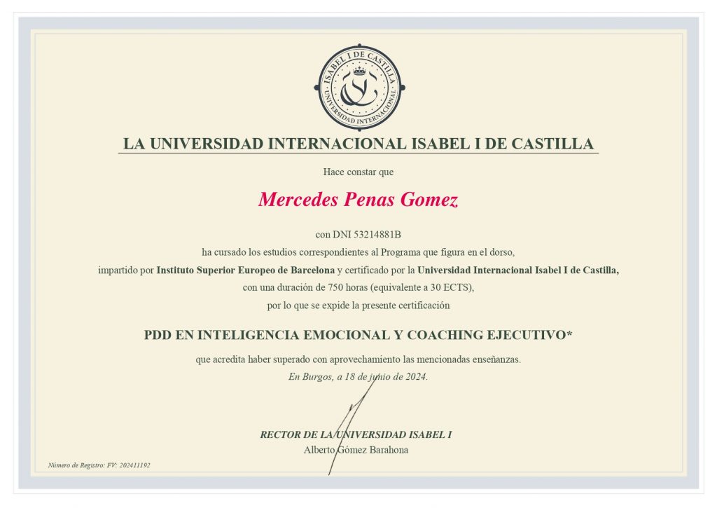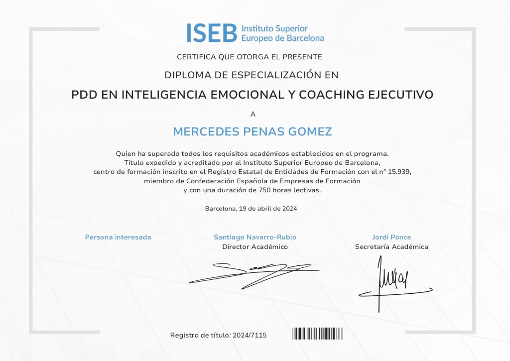 Soy Mercedes, tu coach personal y profesional, comprometida a guiarte en tu camino hacia el crecimiento y el autoconocimiento. Con una sólida formación en coaching emocional y ejecutivo, mi objetivo es ayudarte a alcanzar tus metas y transformar tu vida.